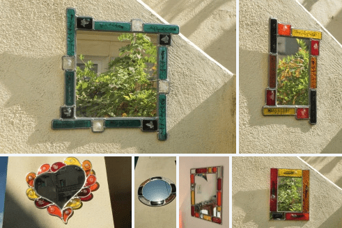 Les pièces sont en verre fondu couleurs feu avec inclusions de plantes.Sertissage à la façon d’un vitrail. Pièce unique. Dimensions : 40 sur 40 cm environ, taille intérieure du miroir 29.5 sur 29.5 cm. Belle taille, superbe effet décoratif.