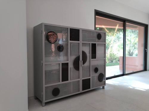 Meuble en fer forgé gris clair dans lequel j’ai ajouté des plaques de verre fondu et sablées à l’arrière pour occulter la vue à l’intérieur. Site de la décoratrice d’intérieur avec laquelle j’ai travaillé sur ce projet : Caroline Bonnet « Blossom » où il y’a deux belles photos http://blossom-agence.com/projets/meuble-sur-mesure-verre-et-acier/